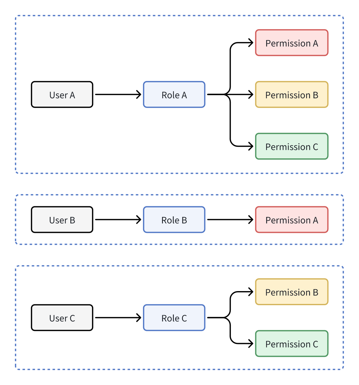 Permission: A role is associated with multiple permissions. For example, the VIP role might have permissions to view, edit, and add, while the super administrator can view, edit, add, and delete.