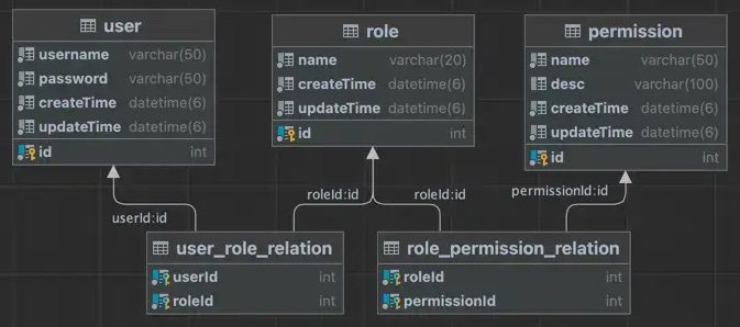 ): Tracks the relationship between users and roles.Role-permission relation table (